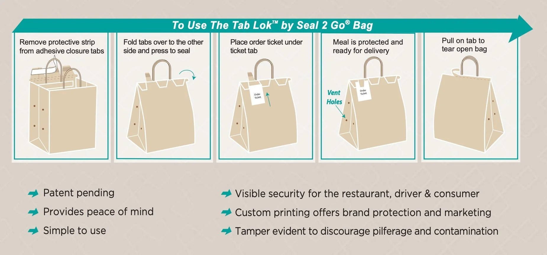The Tab Lok™ is a unique integrated tamper-evident delivery bag system. This product is made from 100% paper with minimum 40% recycled content. It is the perfect packaging solution that offer several benefits for restaurants, 3rd party delivery drivers and consumers. The Tab Lok™ is fast and easy to use. After removing the protective strip from the adhesive closure tabs, fold the tabs over to the other side and press to seal. Place Order Ticket under ticket tab and the meal is protected and ready for delivery. To open the Tab Lok™, simply pull on the perforated tab to tear open the bag.